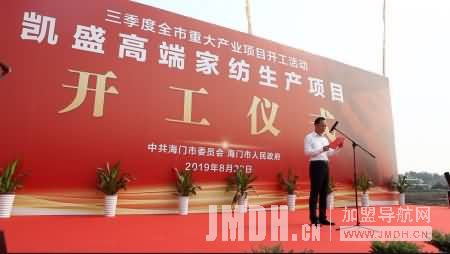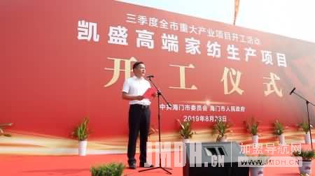 海门工业园区党工委副书记、管委会主任王帆先生为开工仪式致辞。作为展示海门形象的一个重要窗口,海门工业园区拥有独特的专业市场,并将充分依托特色家纺产业,注重质量、品牌、科技的创新工作,加快凯盛重大项目推进和国际物流园项目推进,提升凯盛市场综合实力。